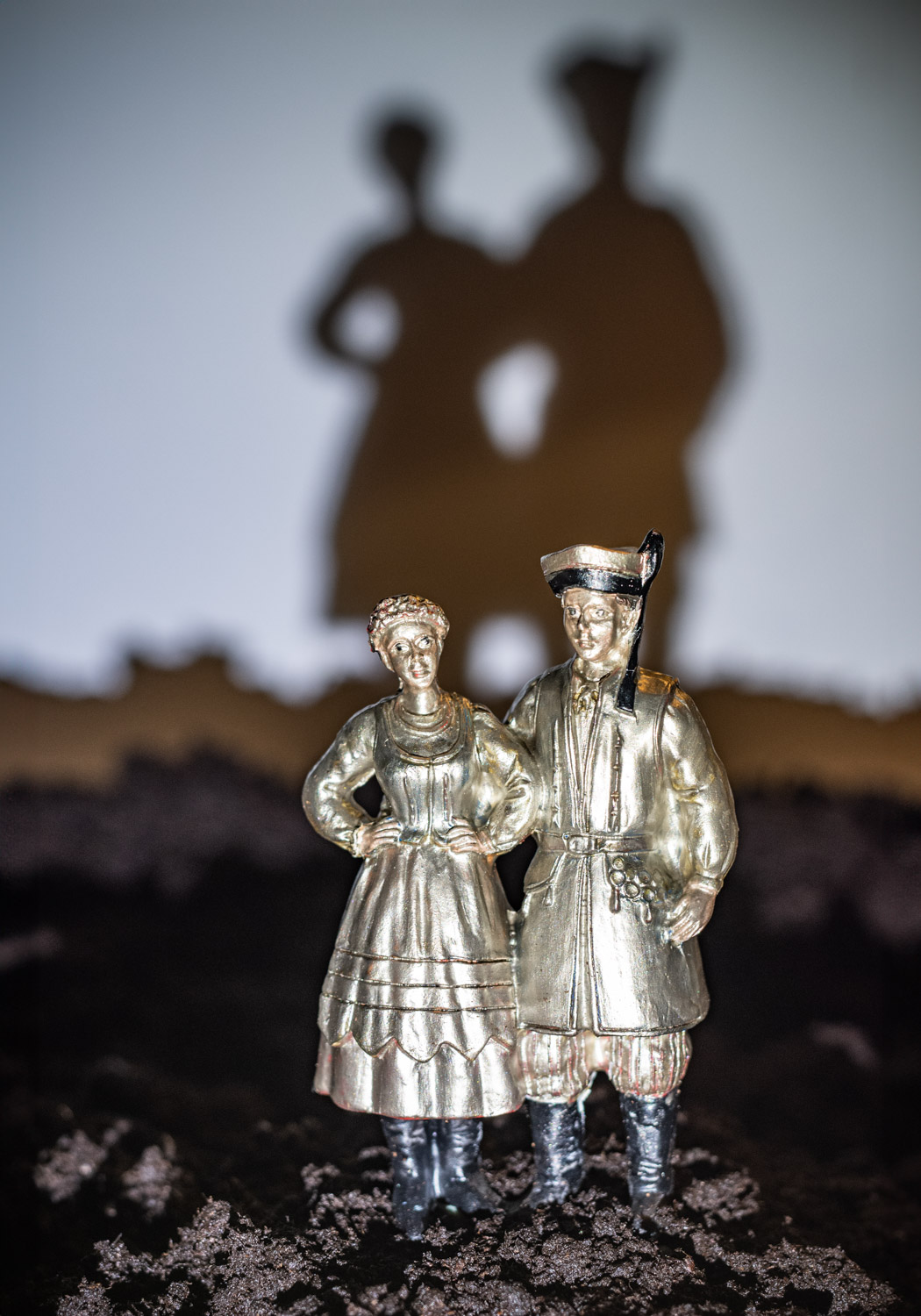 Fotografia przedstawiająca parę figurek w strojach ludowych pomalowane na metaliczny kolor. Folklor mieszający się z ołowianymi żołnierzykami. Duże cienie rzucane na ziemię w tle przywołują na myśl duchy przodków.