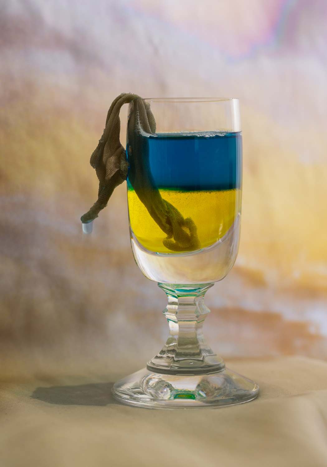 Fotografia przedstawiająca kieliszek dwukolorowego żółto-niebieskiego drinka z nasączoną w nim tkaniną, zapalnikiem. Oczywiste nawiązanie do koktailu Mołotowa miesza się z tradycją picia alkoholu za dusze zmarłych, poległych.